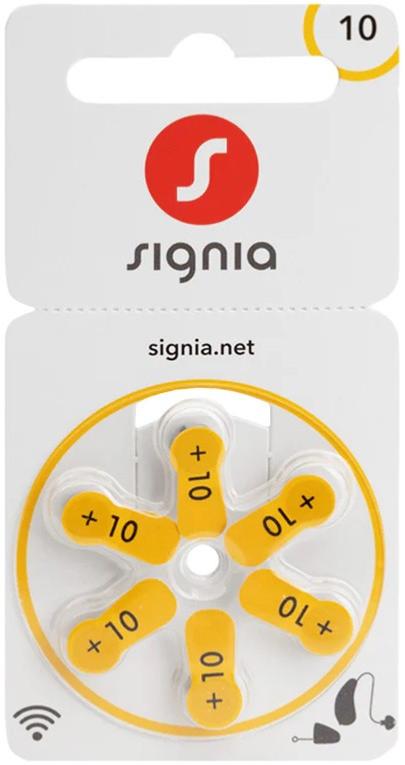 Plaquette de6 piles auditives 10 Signia  de couleur jaune pour les intra auriculaires et les mini contours d'oreille à écouteur déporté. Compatibles avec toutes les marques d'appareils auditifs.